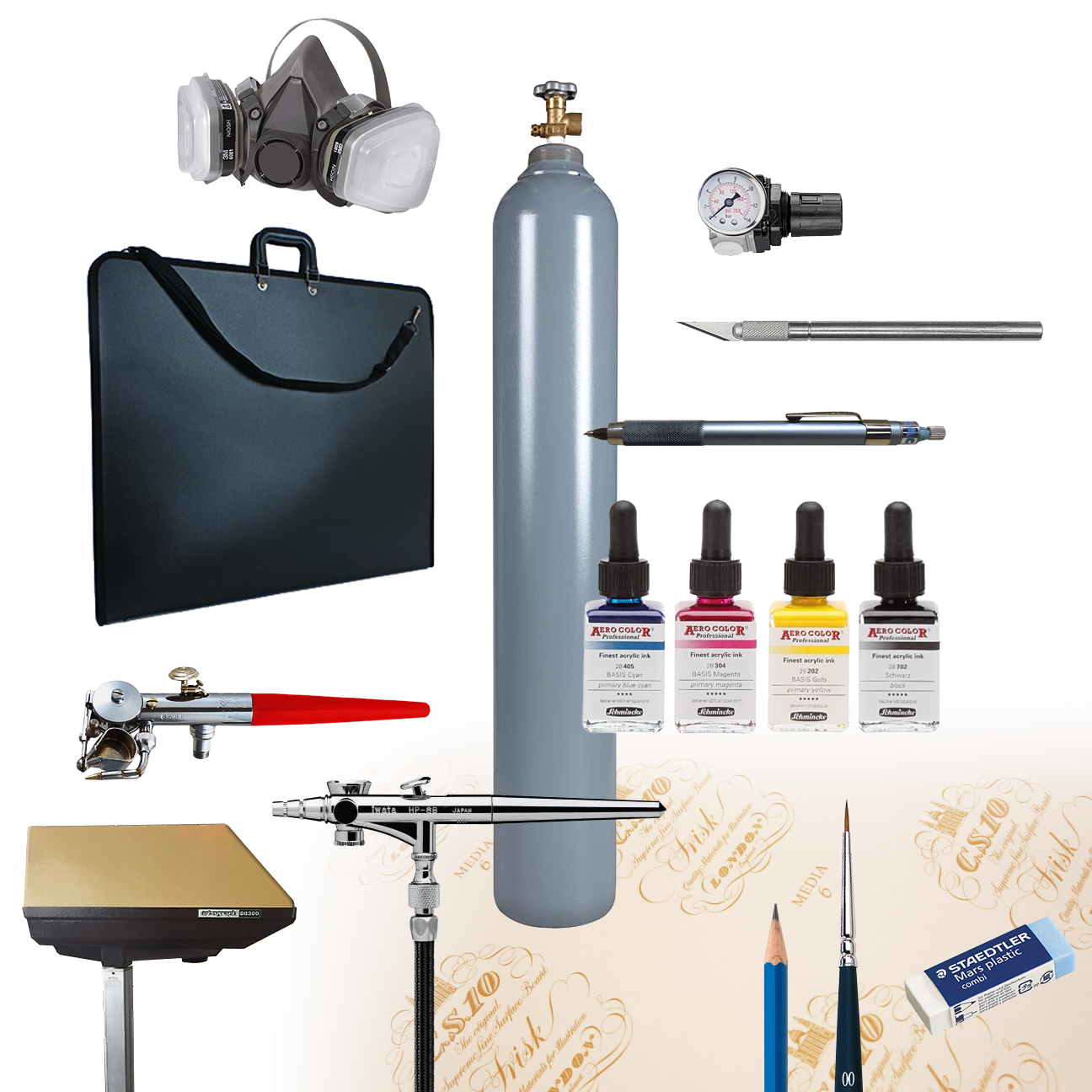 L’équipement nécessaire se constituait ainsi : des crayons à mine de plomb pour l’esquissage et le tracé final, des pinceaux de finition de qualité, des crayons de couleurs, de bonnes effaces blanches Staedler et des effaces spéciales pour enlever le pigment lors d’erreurs, un X-Acto à lames # 11 et un autre à tête pivotante, une bonne règle en métal, un grand rouleau de papier calque de qualité et un grand rouleau de film frisket. J’avais aussi besoin d’un masque respirateur pour me protéger lorsque je vaporisais à l’aérographe de grande surfaces avec du pigment. J’utilisais de grands cartons à illustration de type Frisk CS-10, parmi les seuls qui n’arrachaient pas lorsqu’on retirait les pochoirs. Je me servais aussi de pochoirs courbes mobiles que je découpais dans du carton mince.